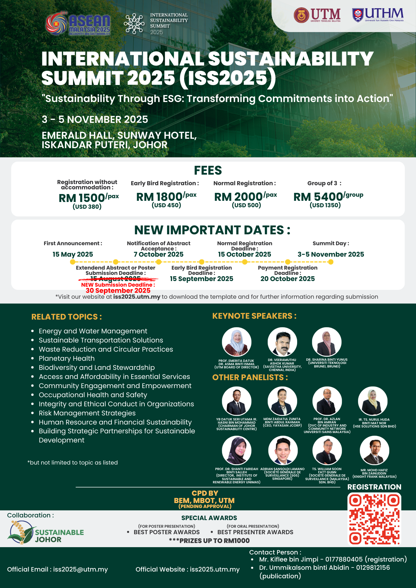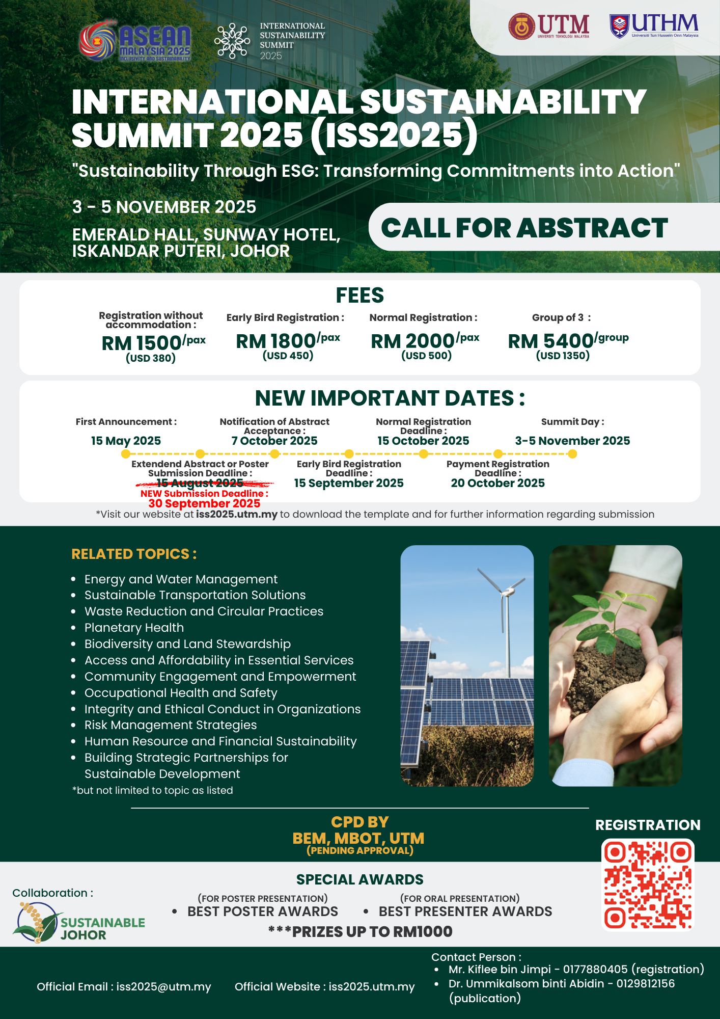 The Organizing Committee of the International Sustainability Summit 2025 (ISS2025) is pleased to announce that the abstract submission deadline has been extended to 30 September 2025.